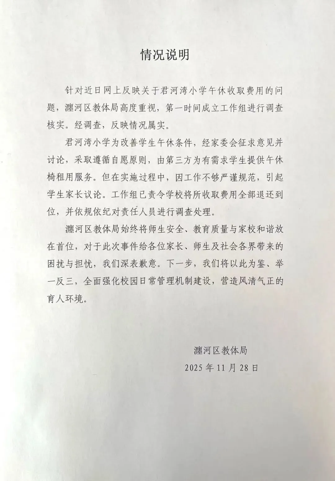 早前报道:河南洛阳一小学收“午休费”一学期115元,教体局:午休椅按天收费,将退费